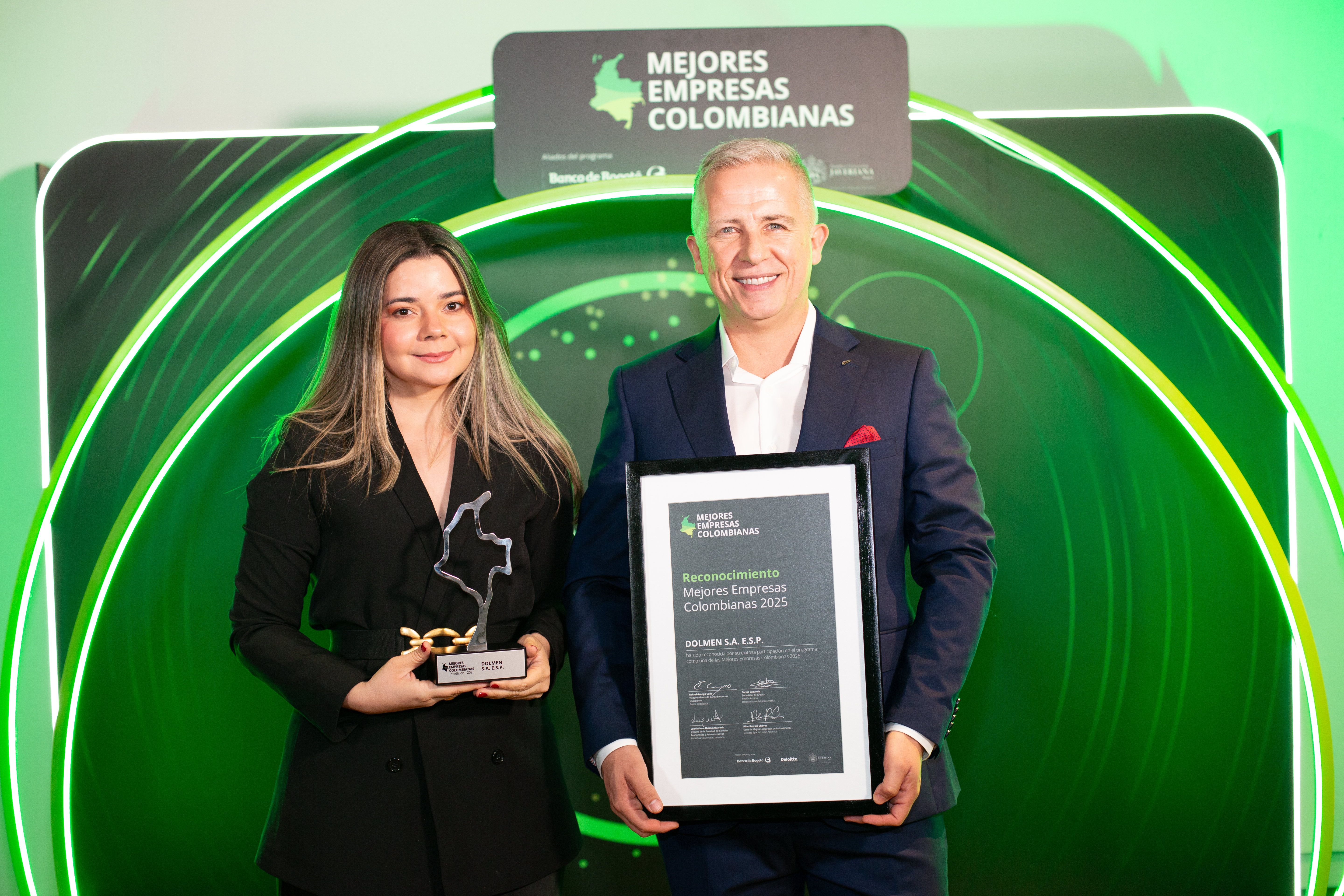 Por primera vez, Dolmen fue reconocida con el premio Mejores Empresas Colombianas (MEC) 2025, la distinción más prestigiosa que pueden recibir las empresas medianas privadas del país. Este reconocimiento es otorgado por Deloitte, Banco de Bogotá y la Universidad Javeriana, aliados estratégicos que evalúan el desempeño integral, la sostenibilidad y la visión de largo plazo de las organizaciones participantes.